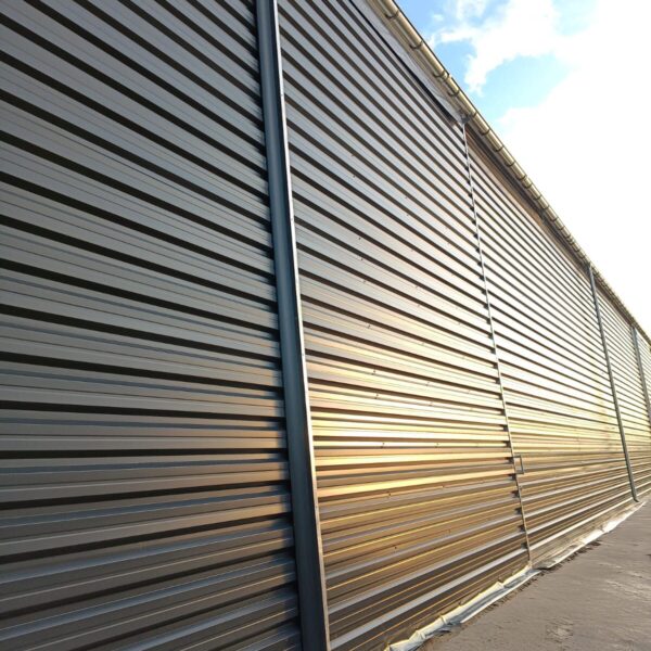Hala o wymiarach 15x45x4,5 m została zaprojektowana jako solidna konstrukcja z zastosowaniem trwałych materiałów. Dach wykonano z blachy trapezowej T-55, co zapewnia wysoką odporność na obciążenia atmosferyczne oraz trwałość na wiele lat. Ściany oraz gible hali zostały wykonane z blachy trapezowej T-35, co harmonijnie uzupełnia całą konstrukcję i gwarantuje spójność estetyczną.